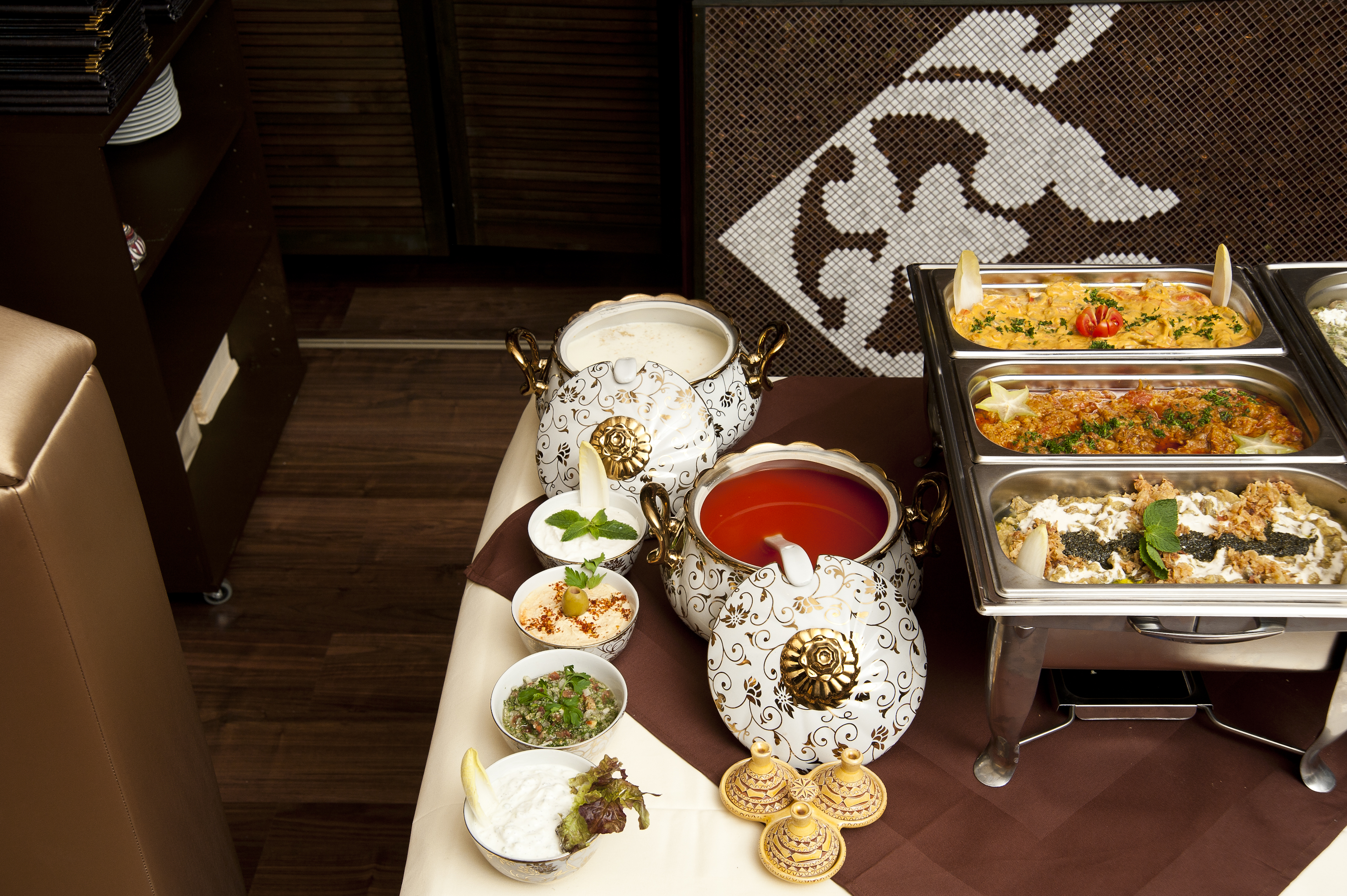 Tauche ein in die Welt orientalischer Spezialitäten und erlebe den Zauber aus 1001 Nacht. Von Montag bis Freitag erwartet dich unser außergewöhnliches Mittagsbuffet mit einer vielfältigen Auswahl: frische Salate, Suppen, Beilagen, kalte und warme Vorspeisen, Fleisch- und Soßengerichte, verschiedene Reis- und vegetarische Gerichte, ein Grillgericht sowie ein Dessert. Genieße ein besonderes Mittagessen – gemeinsam mit Familie, Freunden oder Kollegen.